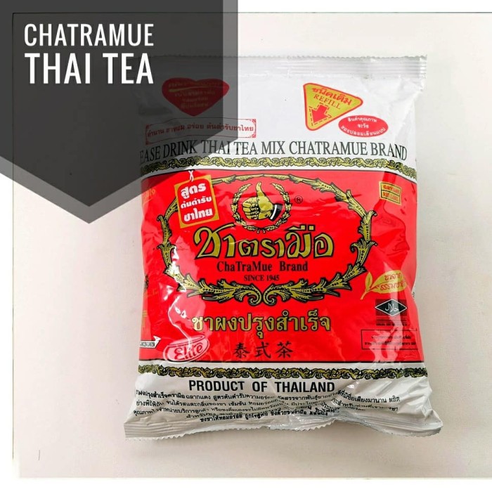 Thai Tea Number One (Chatramue) Brand adalah serbuk teh hitam asli Thailand dengan cita rasa vanila yang biasa digunakan untuk membuat es Thai tea (Thai iced tea), salah satu minuman tradisional masyarakat Thailand sejak dulu. Dengan warna orange yang khas, aroma yang unik dan rasa yang sangat memanjakan lidah.