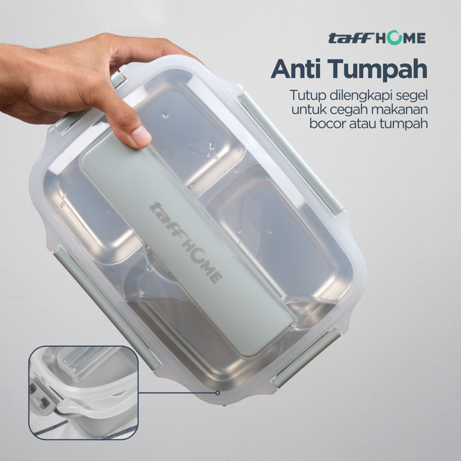 Tutup kotak makan hadir dengan desain semi transparan berwarna gelap yang estetik sekaligus fungsional. Pada bagian tepinya terdapat segel karet berkualitas yang dilengkapi 4 pengunci kokoh untuk mencegah kebocoran. Dengan sistem penguncian rapat ini, Anda bisa membawa makanan berkuah atau bersaus tanpa takut tumpah saat bepergian.