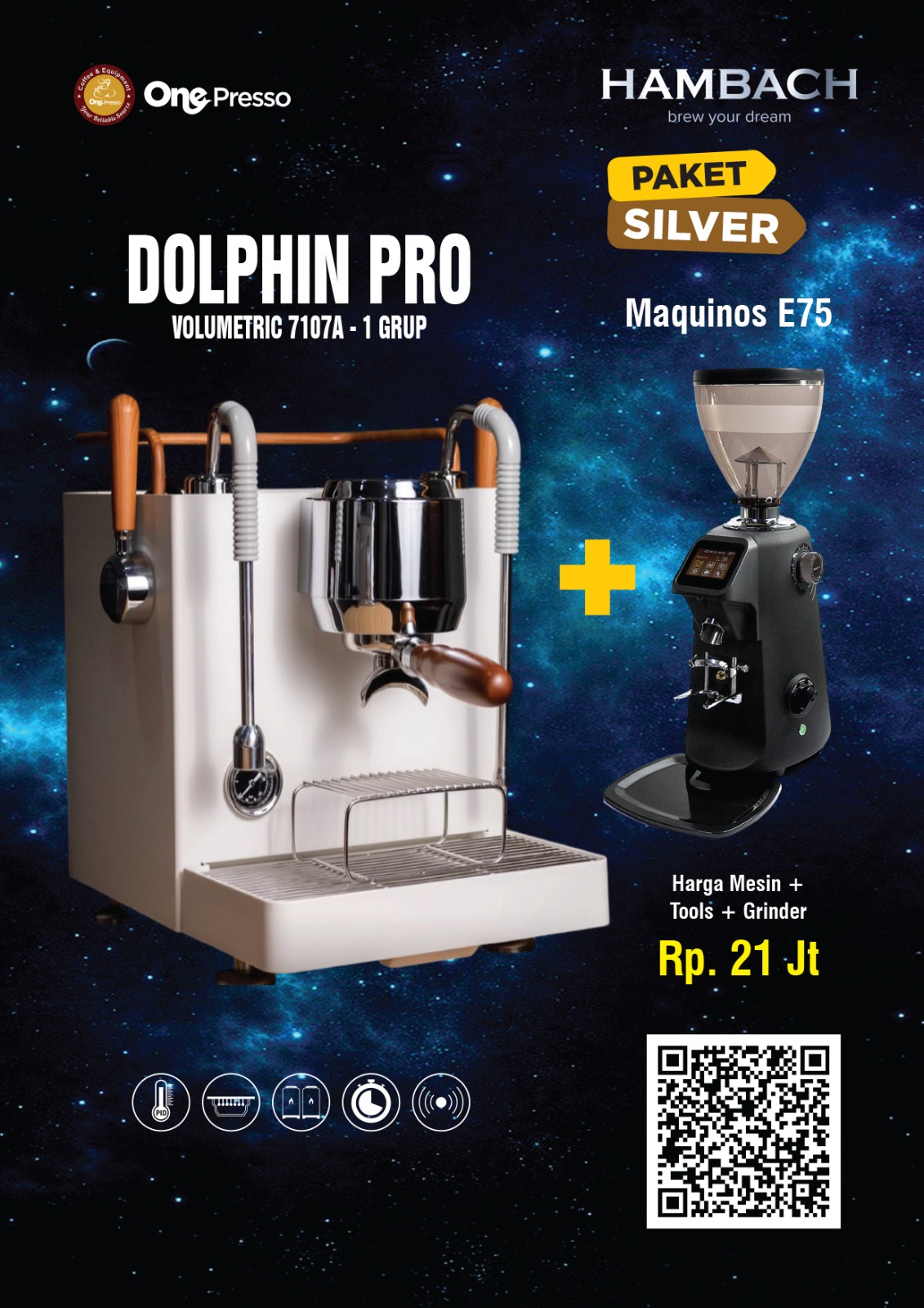 Paket Hambach Silver ini meliputi mesin kopi dengan merk Hambach yang terkelompok 1 grup head, dimana paket ini ada empat jenis mesin pilihan diantaranya : mesin kopi Dolphin 1G, Dolphin Pro 1G, Mini Pro 1G, Seagull 1G.