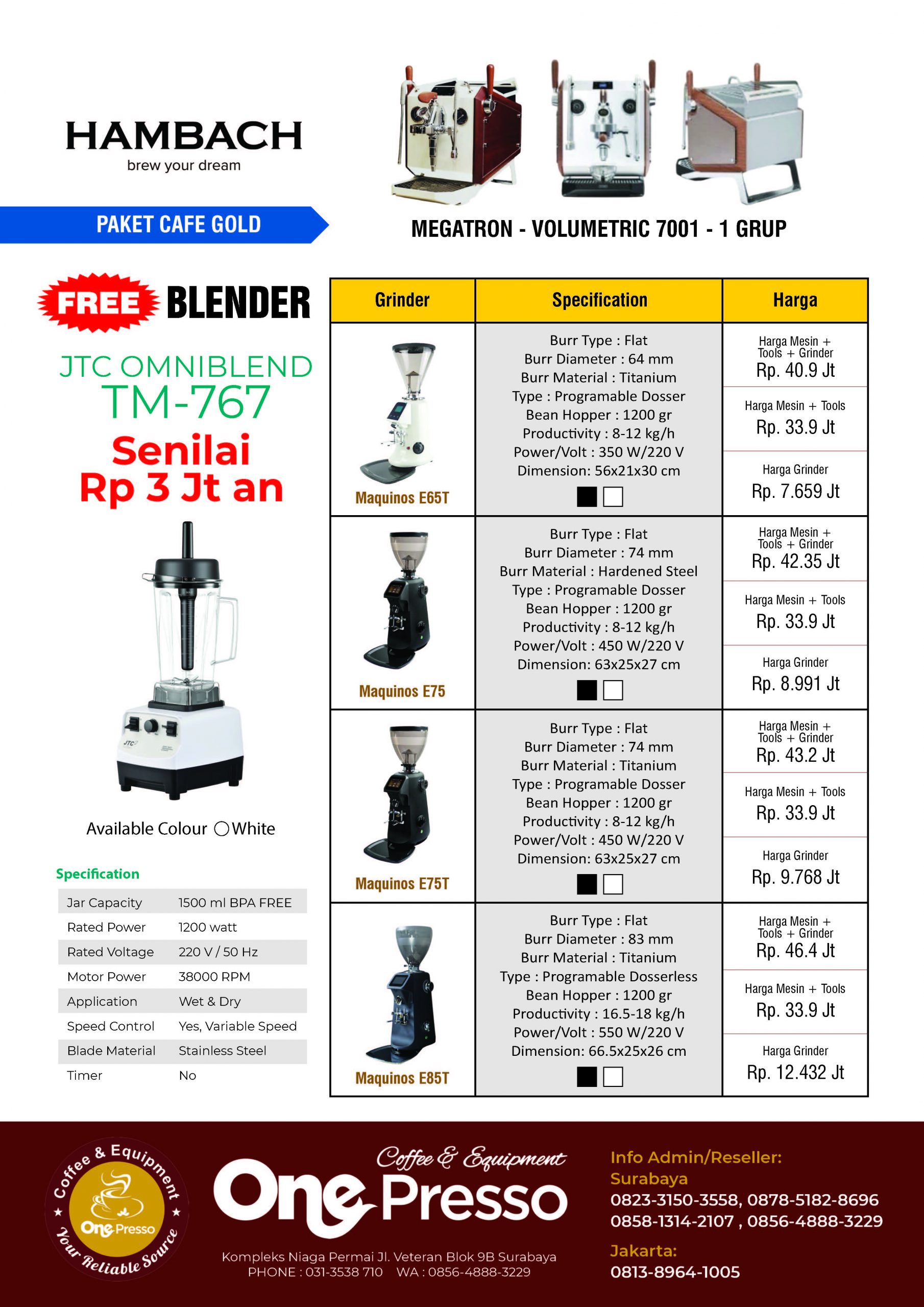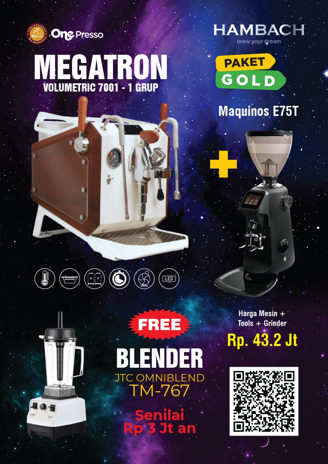 Dapatkan Paket Hambach Megatron Volumetric 7001 – 1 Group dengan Grinder Maquinos E75T sekarang juga! Kapan lagi mendapatkan mesin dengan fitur yang handal bersama grinder yang TOP BGT senilai 9 jutaan, yang bisa Anda bawa pulang bersama dengan bonus Blender JTC Omniblend TM 767 AQ yang senilai 4 Jtan ditambah bonus kopi dan tools.