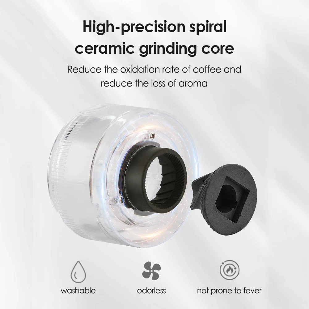 Nikmati kopi nikmat dan segar setiap harinya dengan penggiling kopi portabel AFDEL. Penggiling dapat diatur sesuai selera hasil gilingan Anda dengan sekali putar. Penggiling didesain dengan wadah transparan berkapasitas 170 ml yang pas untuk pembuatan kopi sehari-hari. Coffee grinder ini dapat diisi daya dengan kabel USB Type C dengan kapasitas baterai 1200 mAh, sehingga sangat portable dibawa ke mana-mana.