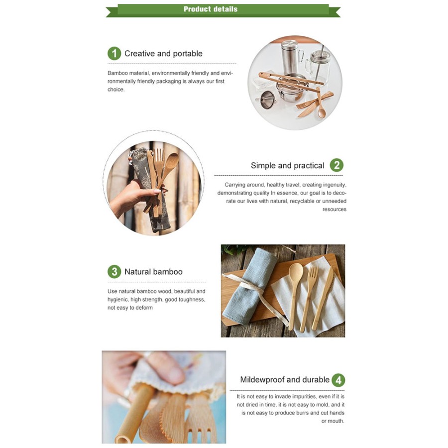 Bahan dari sendok, garpu,pisau, sedotan dan sumpit ini terbuat dari bahan bambu sehingga sangat aman untuk digunakan. Selain itu, cover pouch dengan desain dedaunan yang makin menegaskan bahwa Anda seorang yang ramah lingkungan.