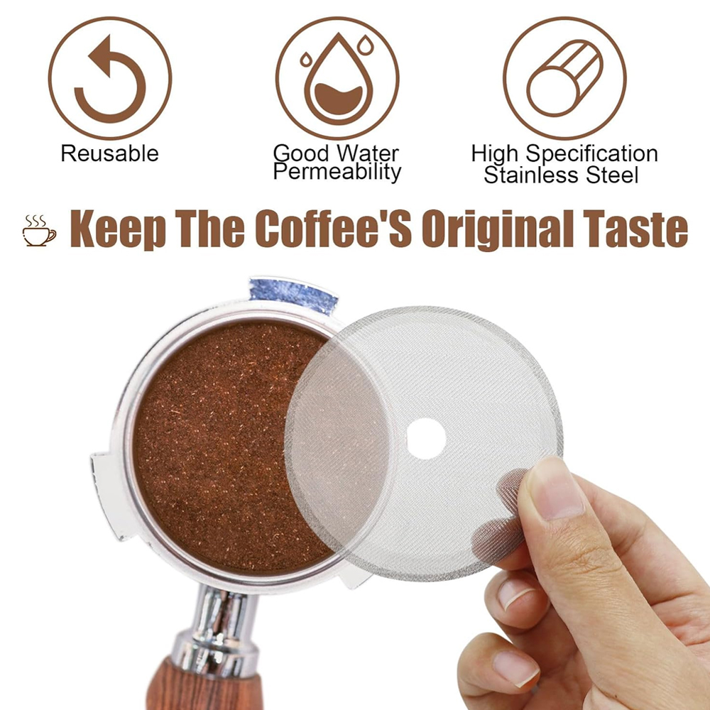 Saat membuat espresso, bubuk kopi yang ditampung portafilter biasanya menempel pada group head mesin kopi. Untuk mengatasinya, Anda bisa menggunakan puck screen espresso. Alat ini berfungsi sebagai penutup portafilter yang telah diisi bubuk kopi. Group head pada mesin kopi menjadi lebih bersih. Puck screen ini bisa dicuci dan digunakan berulang kali karena terbuat dari material stainless steel 304 yang anti karat dan tahan lama.