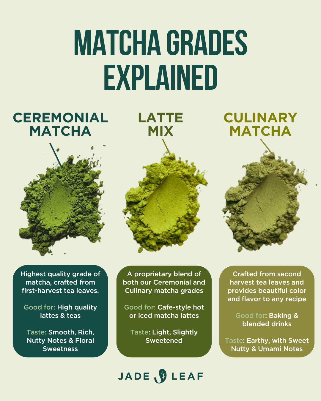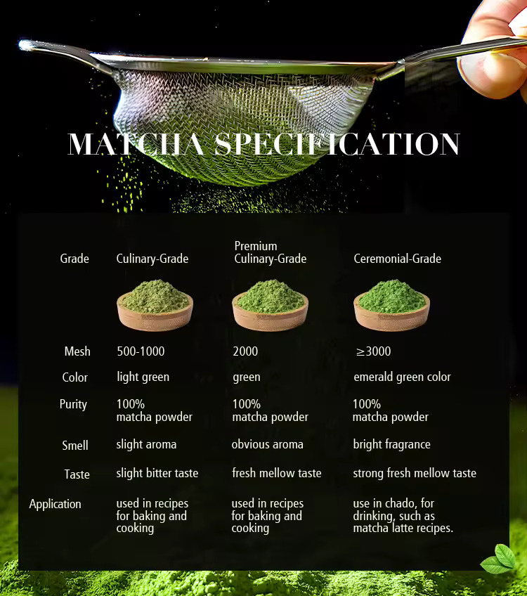 Perbedaan grade matcha terletak pada kualitas daun, yang memengaruhi warna, rasa, tekstur, dan kegunaannya. Ceremonial grade adalah kualitas tertinggi dari daun muda, berwarna hijau cerah, memiliki rasa manis alami, tekstur sangat halus, dan digunakan untuk diseduh murni. Sementara itu, culinary grade dibuat dari daun yang lebih tua, memiliki warna lebih gelap, rasa lebih kuat dan pahit, serta tekstur sedikit lebih kasar, sehingga lebih cocok untuk campuran dalam masakan atau minuman.